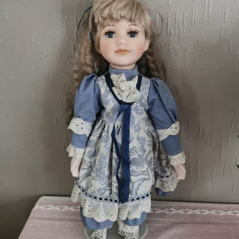 Gammel porselensdukke med stol selges