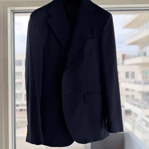 Skreddersydd blådress sydd i Roma, Italia. Laget av Sartoria Gemello. Størrelse 50-52 (Large). Til 185 cm høy mann. Buksebena kan legges ut eller opp etter ønske.