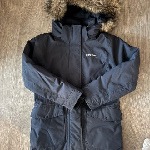 Didriksons vinterjakke. Veldig god, varm og tåler en del. Litt romslig i str. synes jeg. To svake hvite flekker, men har ikke noe å si for bruk. Ser nesten ut som maling (se bld.) som ikke går av i vask. Jakken er nyvasket. Fargen er mer som på bildene hvor jeg viser flekkene. Kan sendes hvis kjøperen betaler porto. Kan sende med billigste alternativ: Postnord for 69kr.