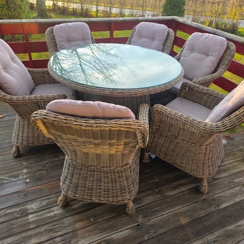 Selger spisegruppe i kunstrotting med 6 stoler og bord, puter medfølger (1 pute uten trekk). Selges samlet for 20.000kr. I svært god stand!