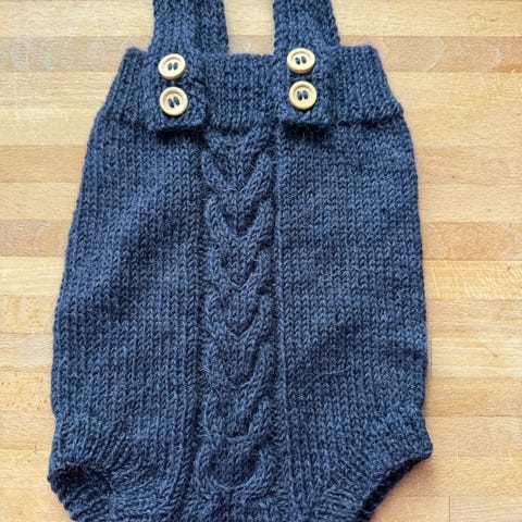 Ny kransromper i 4-6 mnd strikket i Debbie bliss cashmere og merinoull og mørkebrune treknapper ,minibjørn tøfler 0-6 mnd i samme garn.