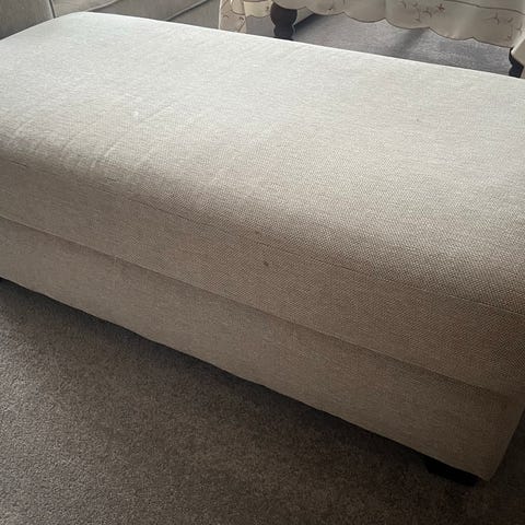 Fin lys beige puff, god til å hvile bena på. Kan også brukes som bord med et fat på.