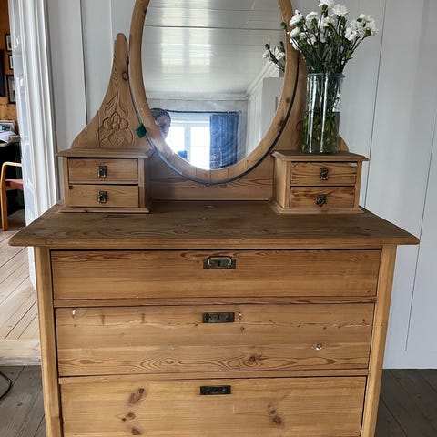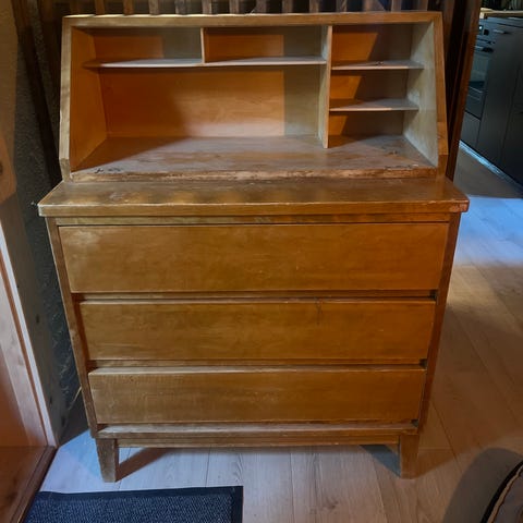 Pent brukt gammel kommode med liten hylle m 4 skuffer på toppen.