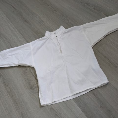 Bunadskjorte i størrelse 128. Stor av størrelse, da den er like lang som en 140-146, kun smalere.