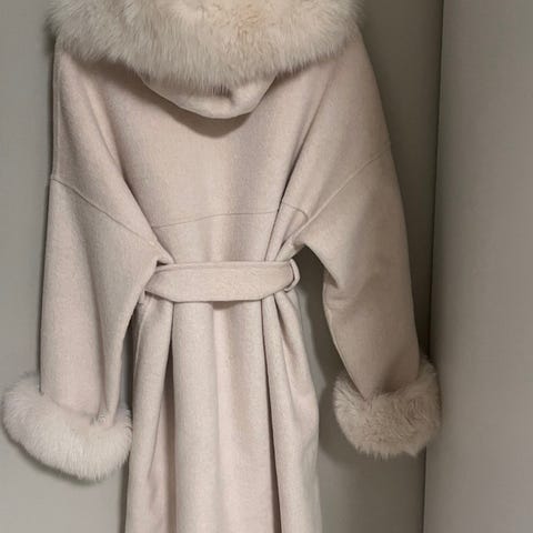 Selger en nydelig lys beige pelsjakk i 100%ull, med pels på hette og ermer som kan tas av. Pelsen er av rev.