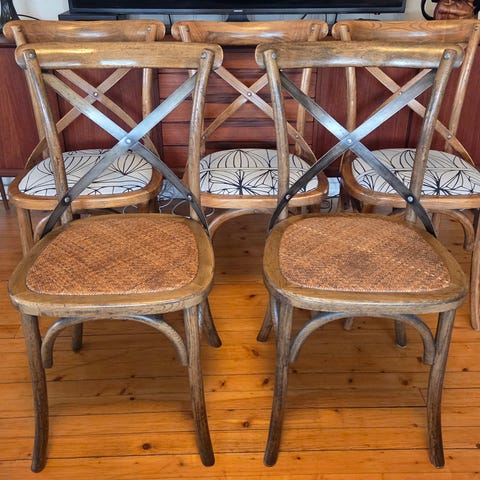 Stolene er i veldig god stand bortsett fra at den ene har en skade (se bilde) som den har hatt lenge før vi overtok dem for 43 år siden.