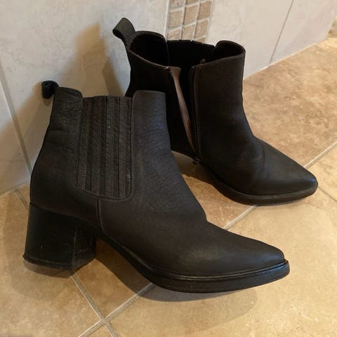 Denne skoletten sitter veldig godt på benet. Skinnet har gjennomhullet mønster. Hel ca 10 cm.
