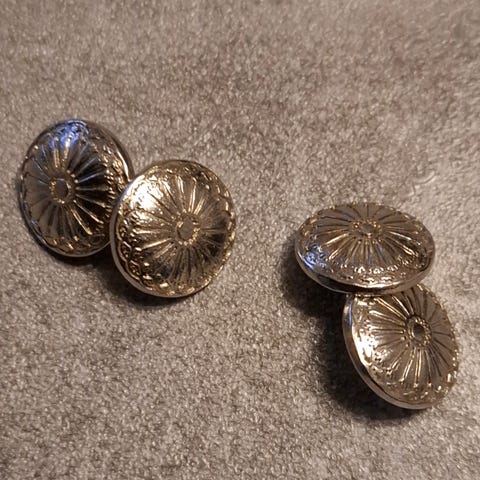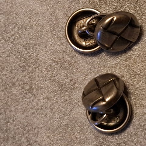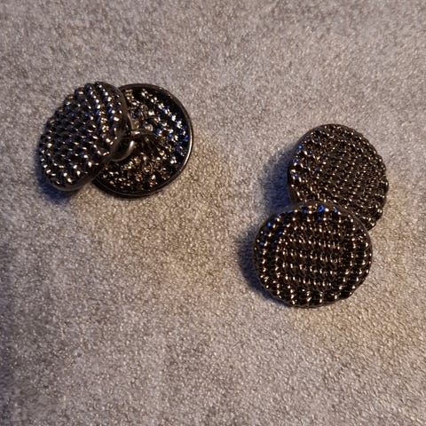 Sølvfarget metall. Ca 1,7cm i diameter på knappene. 2 par for kr 220.