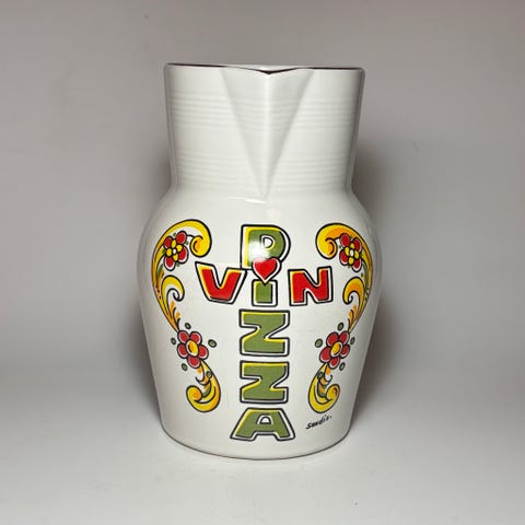Dette er et herlig vintage «Sandis»-krus med teksten «TRIM» i en hjerteform på den ene siden, illustrert av en løpende, hesblesende person i treningsdrakt på den andre siden. Brun hank og brun kant øverst, samt små brune spetter i godset. Tipper sent 70-tall, begynnelsen av 80-tallet? Sandis var signaturen til kunstneren Kåre Sandvand fra Kvinesdal. Kruset har ikke misfarging, krakelering, skader eller nagg. Det er noen få svake teskjespor nedi, men ikke skjemmende. Se bilder. Merket Sandis nederst under den løpende figuren. Høyde: 8 cm. Diameter: 8 cm. Bredde med hank: 11 cm. Vekt: 387 g.
