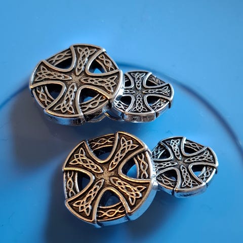 Ca 1,7cm i diameter på knappene. Sølvfarget metall.
