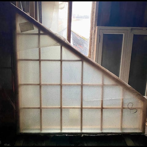 Større glassfelt, ca240x120 med gjennomskimmelige glasser-ikke direkte gjennomsiktige-fin som levegg eller skillevegg eller hva du ellers har fantasi til. Selges tlf 90750221