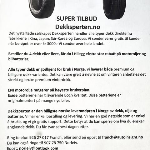 God dag alle sammen, et stort antall dekk er tilgjengelig. Spør etter størrelsen du trenger, jeg sender bilder eller en lenke til annonsene.