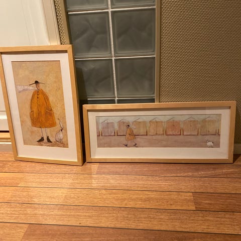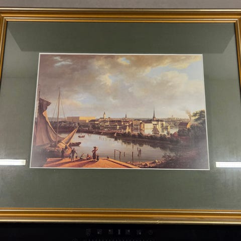 Bildet har en bred hvit passepartout og en enkel, gullfarget ramme. Egnet til veggdekorasjon i hjem eller kontor.