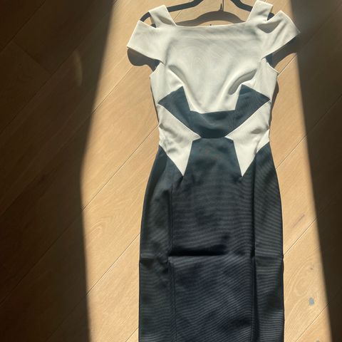 Kjolen har aldri vært brukt. Den har fine detaljer og dyp utringning som gjør kjolen veldig lekker. Størrelsen står EU 40, men er akkurat passe til meg som er mellom 36 og 38 i størrelse. Overdelen har et tynt stoff mens skjørtet er tykkere med et fint mønster.
