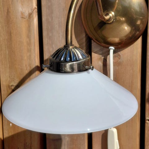 Stilig retro taklampe med kuppel i hvitt glass, flott skjerm i kobber, oppheng og detaljer i messing. Også tak-koppen er i kobber. I god stand for alder med litegrann bruksmerker. Lampen er ca 20 cm høy, lenken inkl. koppen er ca 50 cm. Skjermen er 30 cm i diameter. Ny LED-pære følger med.