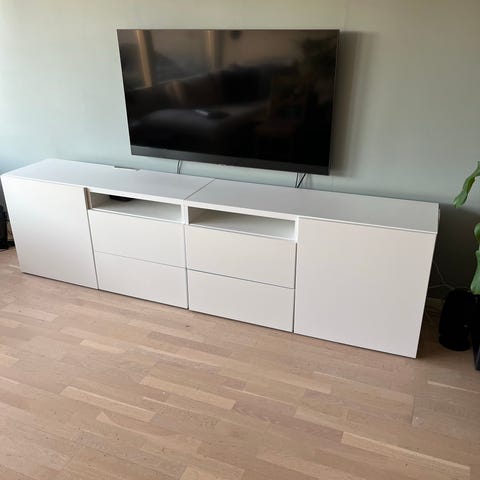 TV-benken er 180 cm lang og består av to moduler. Laget av tre, men imiterer betong. Farge; grå/betonggrå.
