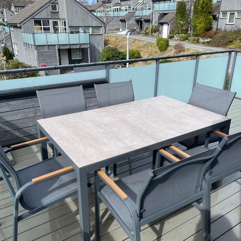 Pent brukt spisebord med stoler fra det tyske kvalitets- / luksusmerket Dedon. Spisegruppen består av et spisebord med glassplate og 6 stoler med gode puter