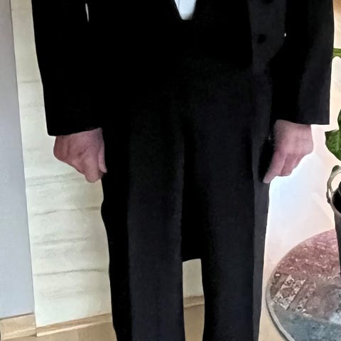 Klassisk smoking, kun brukt et par ganger. Hel og pen, fremstår som ny. Stoff i 100% ull. Magebelte og skjorte følger ikke med.