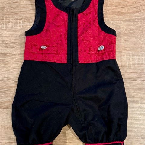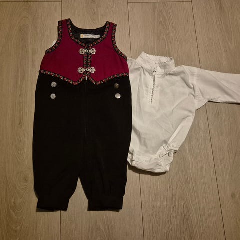 Nydelig bunad til gutt / baby i størrelse 74. Tilsvarer 9 måneder, men kan sys inn til å passe mindre størrelser.