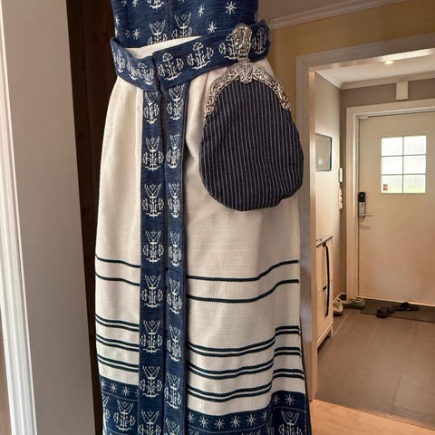 Håndvevet helgedrakt fra Grinakervev i blått med belte og forklede.