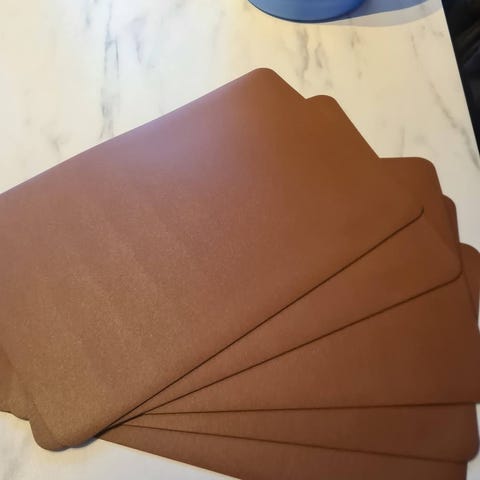 Selger 16 mørkebrune spisebrikker i skinn/skinnimitasjon (usikker på hva det er). Kr 50 pr stk. 33cm x 45 cm