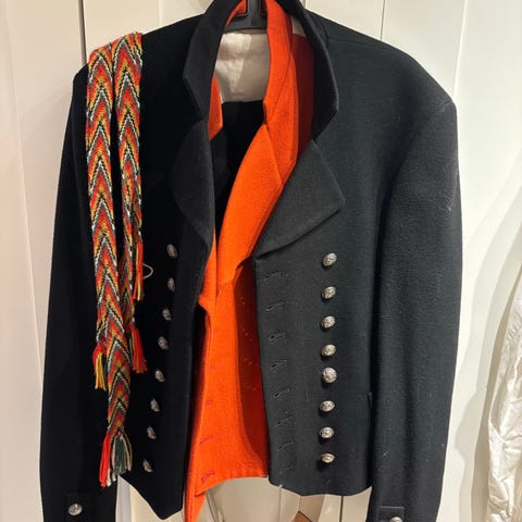 Vestfold herrebunad sydd til mann ca 173. Sydd av min mor i 1999-2000 for min far. Følger med vest, jakke, bukse, bukseseler, tørkle, strømper, 1 hosebånd og halsknapp. Det siste hosebåndet er dessverre borte og bunadskjorta er ødelagt og kastet tidligere. Brukt ca 5 ganger siden den var ferdig. Buksa måler 42cm i hem øvest og 48cm over bredeste del av hoftene. Vesten måler 51 over bryst.