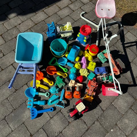 Rydder i uteboden og skal selge unna diverse uteleker. Bøtter og vannkanner spader sil og former. Dette er litt brukt men ikke noe er ødelagt. Dreier seg totalt om ca 20 deler totalt.