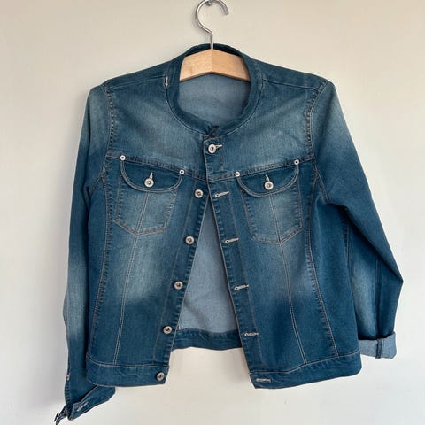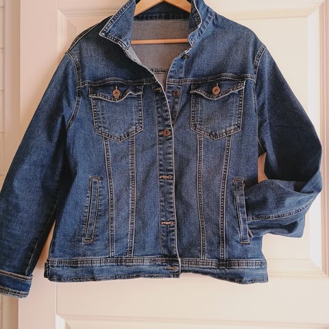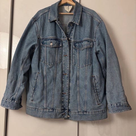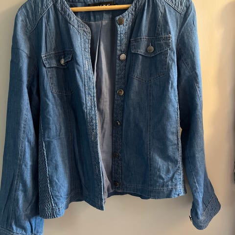 Godt brukt stretchy jeansjakke, lang modell, god passform for dame. Gode stikklommer!