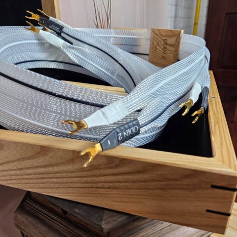Nordost Odin 1.0 meter Bi-wire høytalerkabler. Meget god stand, plasten er fortsatt på på ett sted på begge kablene. Original treeske medfølger. Kjøpt av meg fra 3mA Audio på eBay for 3 år siden. Selges 85.000 - nå ferdig prutet.