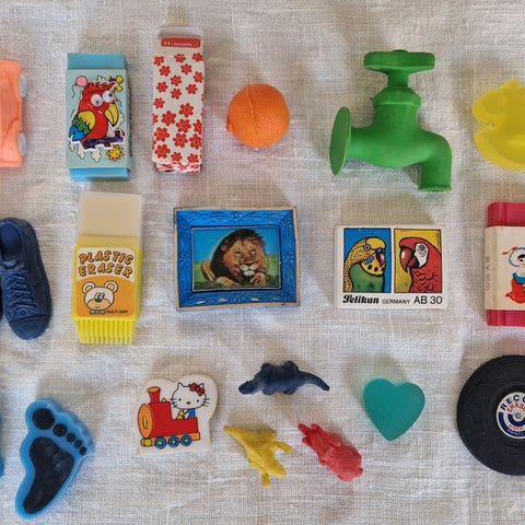 Selger en gammel samling viskelær fra 90-tallet.