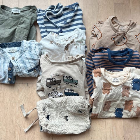 Ullklær. Åtte bodyer og en ullbukse.