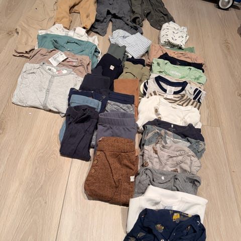 Klespakke str 68. Det er hull i to bodyer og i fem bukser.