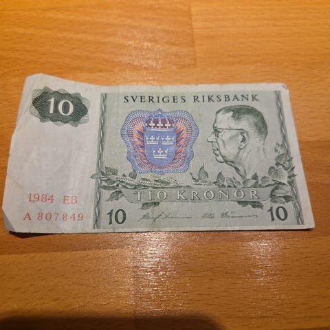 10 kr seddel 1984 s/n: 5391491. Fremstår bortimot strøken. Sendes mot forskudd. Kjøper betaler porto.