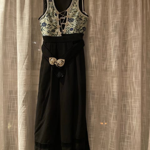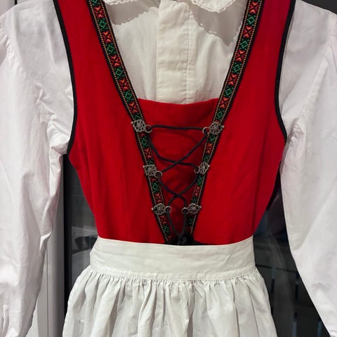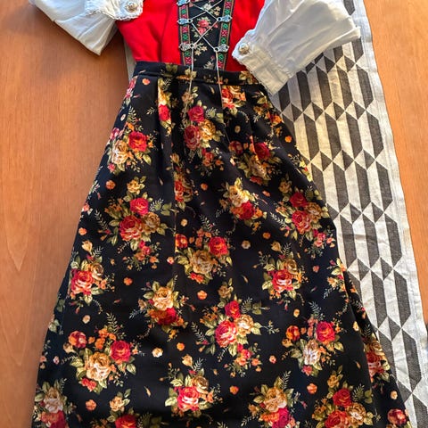 Festdrakt fra Rosenberg i størrelse 140, inkludert skjorte. Festdrakten kommer i det velkjente «Rutaliv og Romdastakk» mønsteret.
