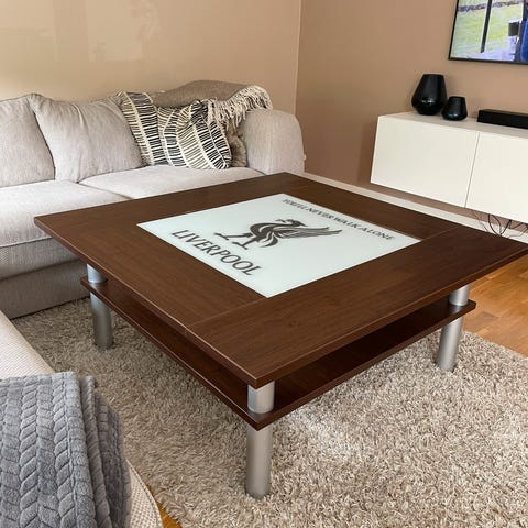 Salongbord i svart metall. Bordplaten har to håndtak og kan enkelt løftes av beina/rammen