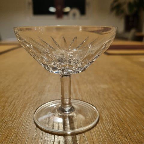 6 gamle glass i originaleske. Glassene er cirka 8 cm høye og ser helt nye ut.
