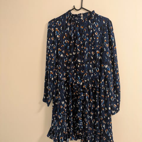 Lang kjole fra Vero Moda i str S. Oransje med lilla og rosa blomster. Knytebelte. Den ene stroppen som beltet kan tres gjennom har løsnet, se bilde. Kan enkelt sys på igjen