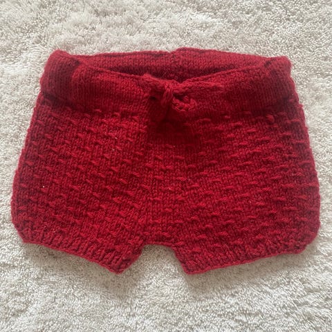 Hjemmestrikket ullshorts i blågrå farge. Strikket i ubehandlet ull. Litt usikker på størrelse, men måler ca 24 cm fra topp til bunn, og er ca like bred.
