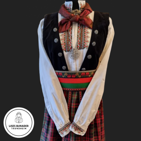 Livet er i sort bomullsfløyel og er dekorert med tinnknapper. Stakken er i sort ull. Forkleet er i rutete bomullsstoff og knytes med vevd bånd. En nydelig svart cape i samme ullstoff som skjørtet, med fløyelskrage, tinnknapper og stripene bomullsfor, følger med. Det følger også med mansjettknapper, øredobber og 2 søljer laget av tinn.