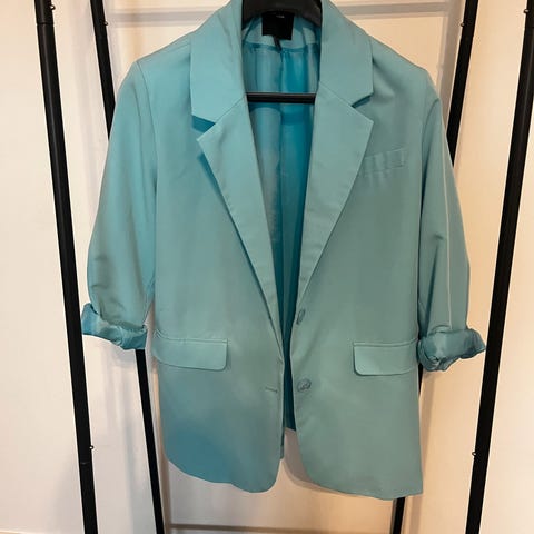 Vero Moda blazer i størrelse 34, oransje farge. Jakken har lange ermer med oppbrett, to frontlommer og knappelukking. Materiale og ytterligere detaljer er ikke oppgitt.