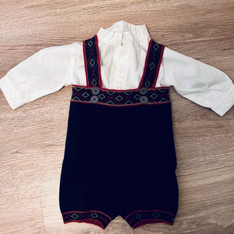 Pent brukt 17. mai antrekk til baby med hvit body skjorte og en fest drakt jumpsuit.
