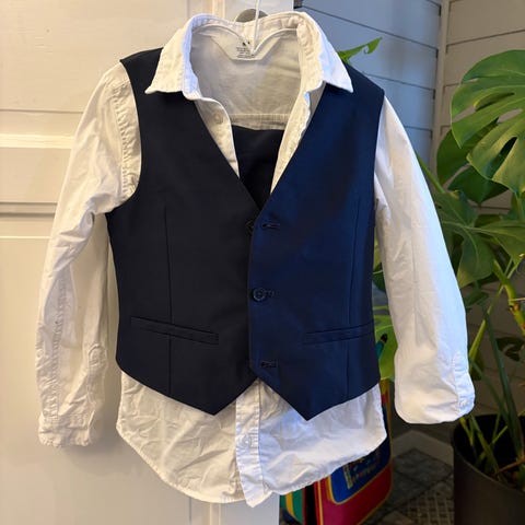 Mørkeblå dress med lyseblå penskjorte selges samlet. Kun brukt en gang på 17 mai. Nypris 1200kr, selges til 500kr.