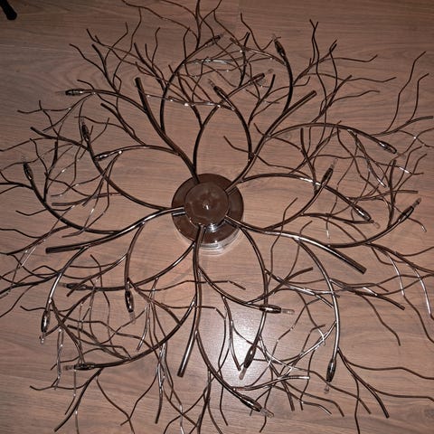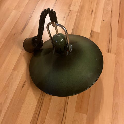 Gir veldig fin belysning. Måler 58 cm i lengden og 20 cm i høyden. Rektangulær deksel til ledningene i taket.