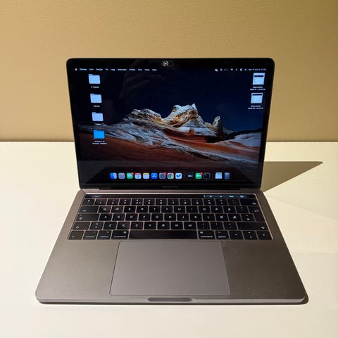 Selger en pent brukt MacBook Pro 13-tommer (2017-modell) med to Thunderbolt 3-porter i fargen Space Gray.