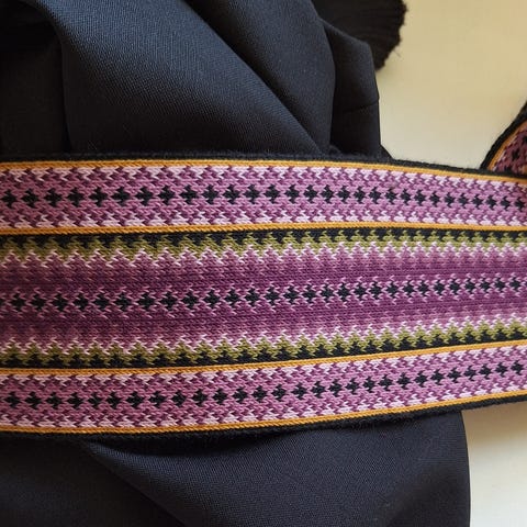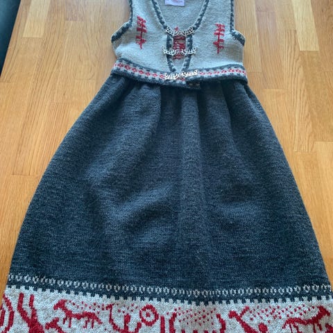 Helgestakk med skjorte. Stakk i tynn, mørk blå ull, upplut/liv i brokade bomull/syntet foret med baskerlin og kantet med skråband i kunstmateriale og amagramband. Skjorte i tynn bomull med trykt mønster. Beregnet for ca 5 til 8 år ved å slippe ned legg og flytte stakken ned på uppluten. Tilpasset ca 6 år nå. Skjorta er beregnet å dekke samme størrelsesintervall. Se bilder med mål. Gi gjerne bud!