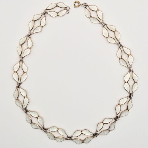 Et nydelig , arvet halskjede som aldri har vært i bruk. Det ser ut som det er laget i stål eller tilsv. Det er bygget opp med elementer som ligner musikkens g-nøkler. 😊