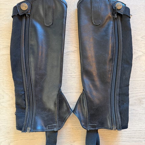 51 cm høye, med elastikk ved glidelås. Se bilder for andre mål. Passer nok en normal til bred legg.