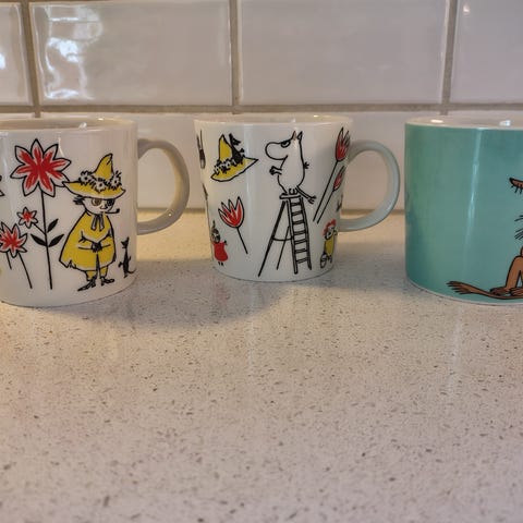 Koppene er av merket Arcopal, og er stemplet under med Arcopal France. Arcopal er en form for herdet glass, som på 1960-tallet ble brukt i kjøkken artikler som en substitutt for vanlig glass. Det at glasset er herdet, betyr at de har sterkere slitstyrke enn vanlig glass, og derfor tåler mer. Produksjonen av produkter i dette materialet er ikke vanlig i dag.