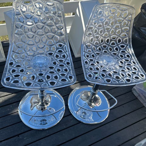 Stoler i hardplast og krom. Vakkert dekorert. Solid fotstøtte. Praktisk med gaslift. Selges som par, 2 stk. Må selves pga av flytting. Helt nye. Ny pris kr 3980,-