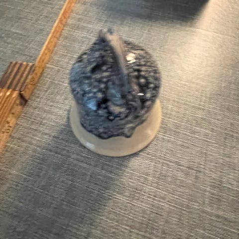 Denne finner jeg ikke makan til. Nesten, men ikke akkurat samme. Den er da også signert med et symbol av noe slag. Tenker vi nærmer oss ekvator, og setter min lit til Afrika ...eller er vi i sør-øst Asia mogens. Strå eller bambus...? Uansett en stilren krukke, håndlaget, og i sjangeren art deco / funkis brun. Godt utført arbeid fra pottemaker. Malt/emaljert også inni og under. Grei størrelse, form-klassiker, fett holdt; hva mer kan man ønske...